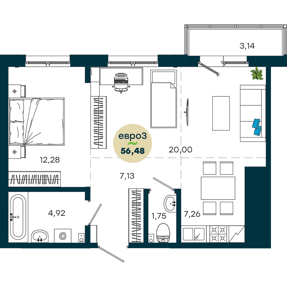 2-комнатная, 56.48 м²