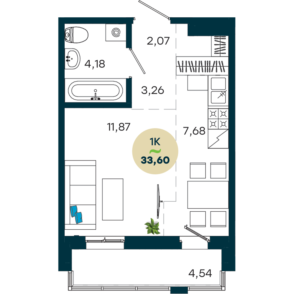 1-комнатная, 33.6 м²
